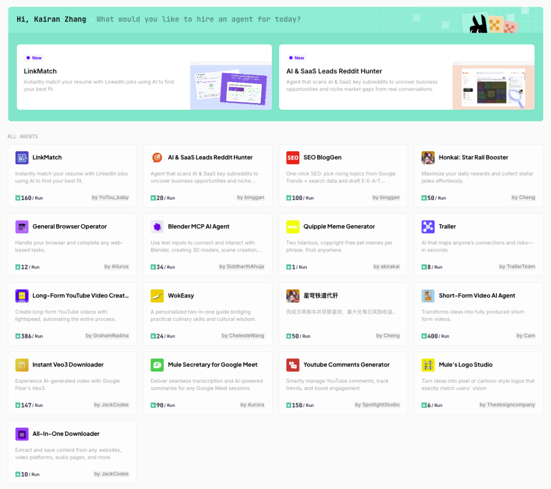 凭据官网上的说法,Mulerun 是“寰球首个 AI Agent 市集”,所谓 “Agent 市集”即是由用户自行上传 Agent,然后供我方或其他用户使用,并依据在该 Agent 上铺张的算力积分得回收益,平台则会有一定比例的抽成(按公众号 NLP Agent 的说法,抽成为 5%)。但因为之前的 MyShell 等产物,其本人是一个对接 Agent 供需两边的平台,也有可提现的开拓者奖励机制,关于官方的“各人首个”的表述,不作念考虑。